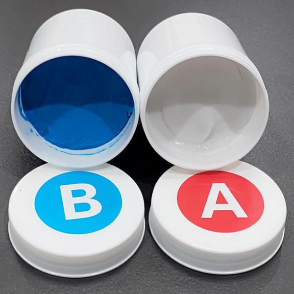 1. Under the room temperature, take the same amount of base component(blue) and catalyst component (white).