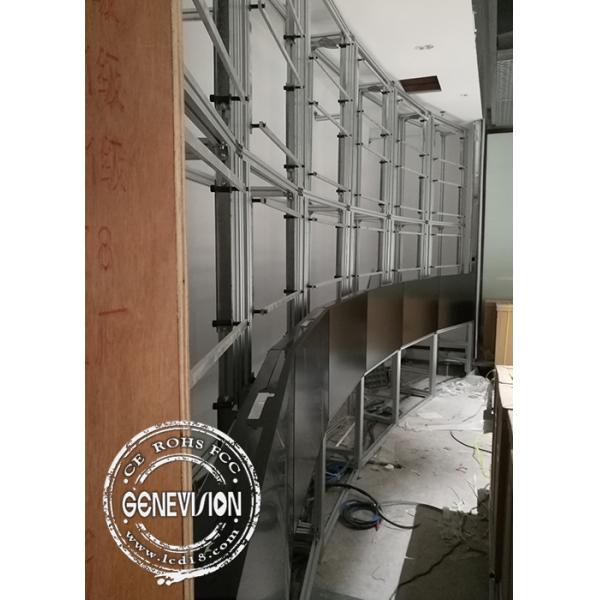 Genevision developed curved touch screen video wall, curved degree can be customized as per your site requirements, and with hydraulic pressure front maintenance bracket, it's easy to be fixed if any problem, and you don't need to take out all panels one by one. Touch screen is 10-point IR touch frame, fast responsiveness can be can be curved as per the video wall screen to make sure both match exactly, it's amasing to have such a large video wall with interactive function, this is especially well used for video studio rooms.