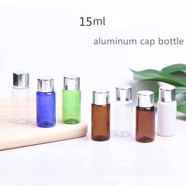15ml cosmetic lotion bottle , the color of bottle is brown , clear , white , green , and blue . It's made of high quality plastic PET , durable and BPA free . And the color of lid is silver , aluminum technology . Assembly with bottle , it can be used for lotions , creams , cosmetic samples , personal care producst , and so on . Good for daily life and travel .