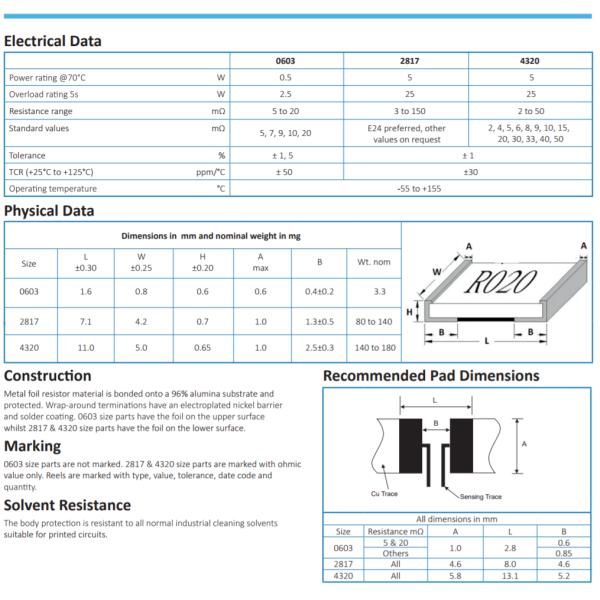 Metal foil resistor material is bonded onto a 96% alumina substrate and protected. Wrap-around terminations have an electroplated nickel barrier and solder coating. 0603 size parts have the foil on the upper surface whilst 2817 size parts have the foil on the lower surface.