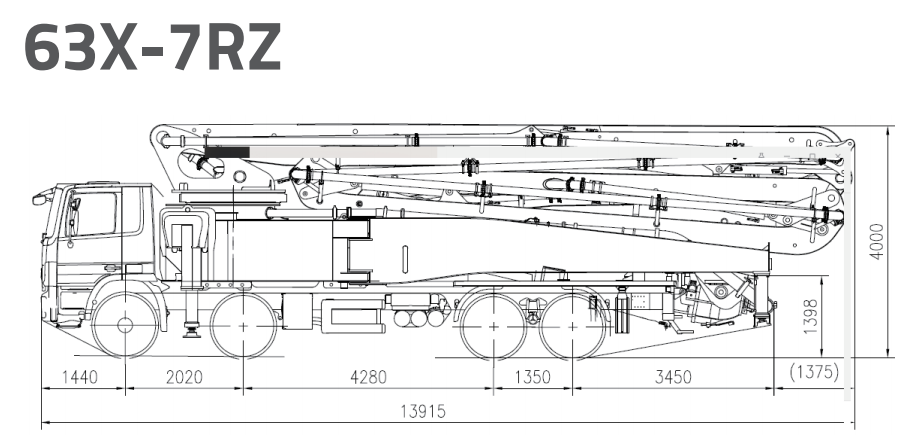 • This is a 63m truck pump with pumping high-volume concrete. Max. pumping output is 180m³/h, meaning high construction efficiency. This truck pump can be mounted on 4 axles or 5 axles chassis.
