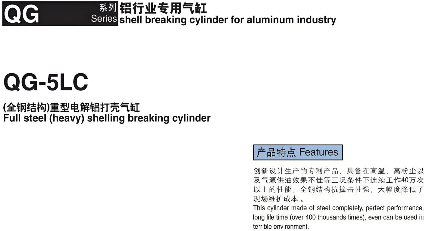 | QG-1/QG-2 | cylinders with valves,fitted with throttle,speed regulation,buffer mechanism,are of compact structure, easy of use, resistant to high temperature, exerting great striking impact and highly reliable.These two varieties are mainly used in aluminum factory for material feed and aluminum tapping of the electrobath tank and arenecessary pneumatic elements in automated production of an aluminum factory |