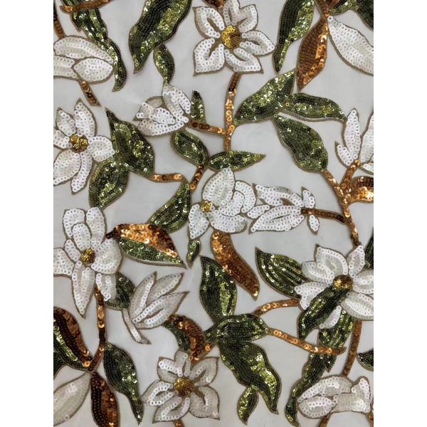 The fabric features a stunning design with intricate embroidery and sequin detailing. The sequins are carefully sewn onto a mesh ground, creating a delicate and elegant look. The flower design is perfect for adding a touch of nature to any project, making it ideal for spring and summer projects or for adding a pop of color to your home decor.