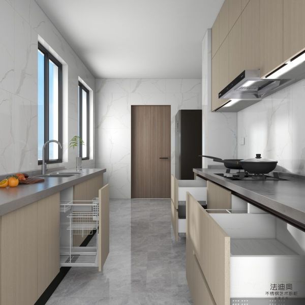 This Fadior stainless steel kitchen cabinet set features a practical double linear design with a light wood grain finish, combining aesthetic appeal with outstanding functionality. Designed for maximum storage, the cabinets are equipped with specialized pull-out baskets for dishes and seasonings, as well as multiple drawers for various kitchen essentials. The stainless steel material ensures durability and resistance to stains, making it an ideal choice for a clean, modern, and fully customized kitchen. Whether you are preparing meals or organizing your kitchen tools, this design offers both elegance and convenience.